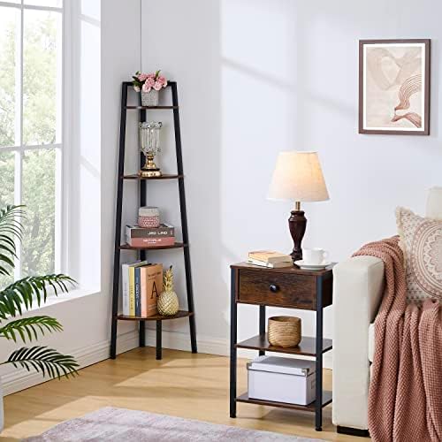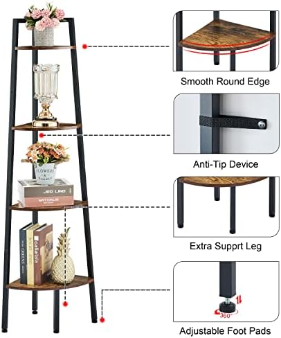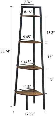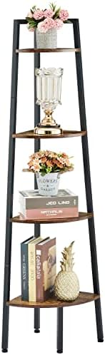 Hoctieon Corner Shelf, 4-Tier Corner Bookshelf, Rustic Corner Ladder Shelf, Industrial Display Shelf for Living Room, Kitchen, Home Office, Balcony, Small Space, Metal Frame, Rustic Brown