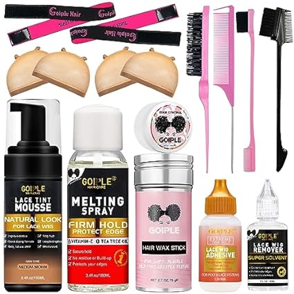 • 【Perfect Wig Installation Kit】The package included:1pc 3.4fl.oz medium brown lace tint mousse+1pc 3.4fl.oz melting spray+1pc 1.34fl.oz lace glue+1pc 1fl.oz lace glue remover+1pc 1.05oz edge control+1pc 2.7oz hair wax stick+4pcs wig caps+1pc hair brush+1pc bristle brush+1pc double-sided edge brush+1pc multifunctional edge comb+2pcs wig bands.
