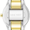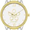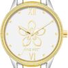 - Silver-tone dial with floral design; white filled gold-tone hands and markers