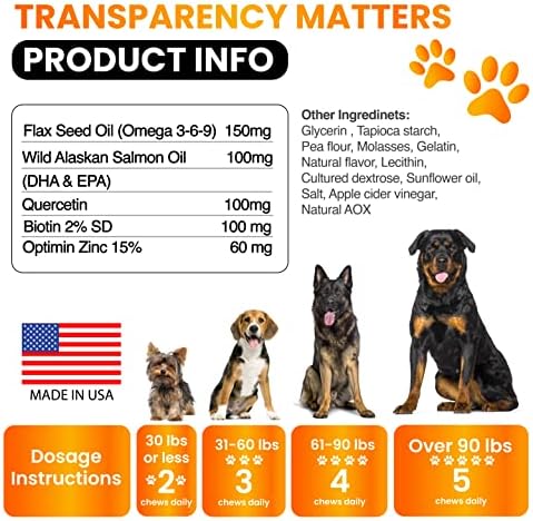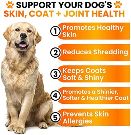 • Itch & Dog Allergy Relief: Containing important amounts of flax seed oil and Alaskan salmon oil, our skin and coat supplement for dogs is packed with Omega 3, 6 and 9, DHA and EPA, as well as biotin and zinc for your dog’s long-term health!